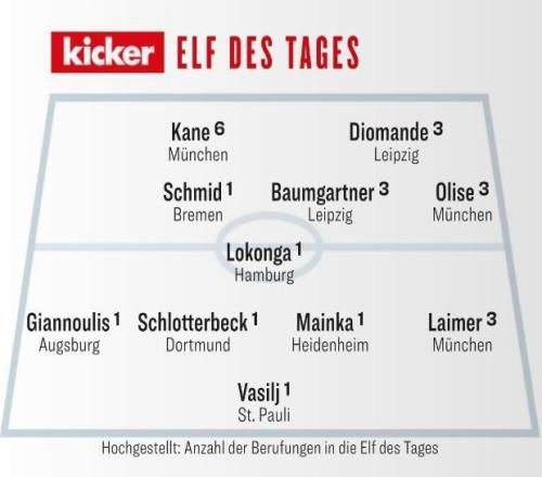 本周一,《踢球者》公布了他們?cè)u(píng)選的德甲第13輪比賽最佳陣容,其中凱恩、奧利塞、施洛特貝克、萊默爾等人在列。