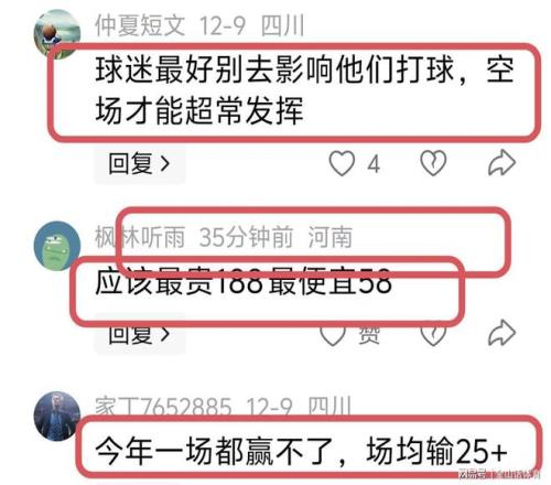 用“全華班”去打別人4節(jié)7人次外援球隊(duì),票價(jià)還不愿意“跳水”,球迷們也是怨聲載道,紛紛吐槽道“免費(fèi)請(qǐng)我看都不看,讓這些人自娛自樂吧”;“球迷最好別去影響他們打球,空?qǐng)霾拍艹0l(fā)揮”;“應(yīng)該最貴188 最便宜58”;“今年一場(chǎng)都贏不了,場(chǎng)均輸25+”;“免費(fèi)都不得去,沒有意思”……