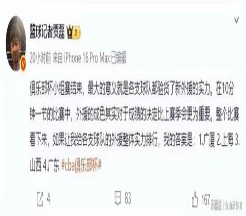 經過休賽期的厲兵秣馬,各隊的引援工作,如今基本上進入尾聲。通過俱樂部杯賽的檢驗,各隊所引進的外援“是騾子是馬”,也基本看出了端倪。日前,國內著名體育記者賈磊排出了新賽季的外援實力榜,這位資深媒體人,通過俱樂部杯賽各隊的外援表現(xiàn),分析得出結論,認為外援實力最強的四支球隊,分別是廣廈男籃、上海男籃、山西男籃和廣東男籃。