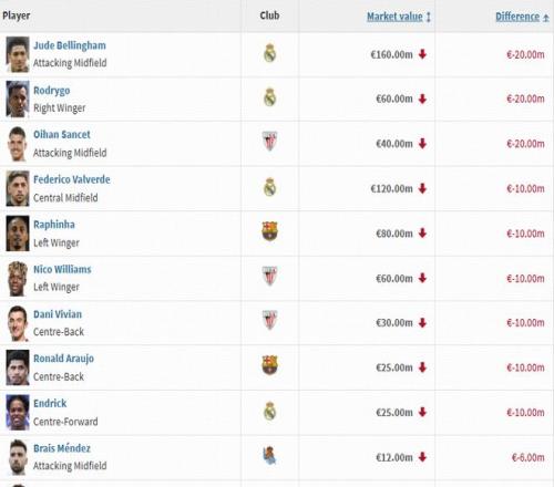北京時(shí)間12月12日,德國(guó)轉(zhuǎn)會(huì)市場(chǎng)更新了西甲球員身價(jià),新一期的身價(jià)跌幅榜也隨之產(chǎn)生。其中貝林厄姆、羅德里戈下跌2000萬(wàn)歐,巴爾韋德、拉菲尼亞下跌1000萬(wàn)歐。