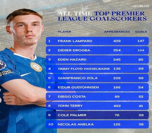 根據(jù)統(tǒng)計(jì),到目前為止,帕爾默已經(jīng)代表切爾西在英超中打進(jìn)39粒進(jìn)球,超越阿內(nèi)爾卡,獨(dú)占隊(duì)史英超射手榜第9名。