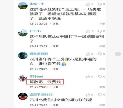 不過四川隊擺爛是有原因的,那就是他們近兩年資金鏈緊張、頻頻欠薪,俱樂部投資人因為債臺高筑身陷囹圄,俱樂部內憂外患,球員士氣低迷,最終在主場遭遇了一場載入史冊的慘敗。球迷也是為四川隊感到嘆息,“唉,沒錢就啥也不行了”、“這樣的球隊留在CBA沒有意義”、“解散吧,浪費錢”了。不知四川隊還能挺多久?不解散也得盡快出賣了吧。你們說呢?