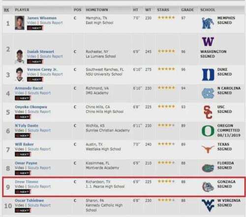 2019年德魯高中畢業(yè),ESPN綜合評(píng)分88分四星高中生,在全美同位置中鋒中排名第9,而當(dāng)屆排名第1的潛力中鋒是大聰明懷斯曼,第2是莽牛斯圖爾特,德魯收到全美多所D1級(jí)大學(xué)招募,最終選擇加盟岡薩加大學(xué)。