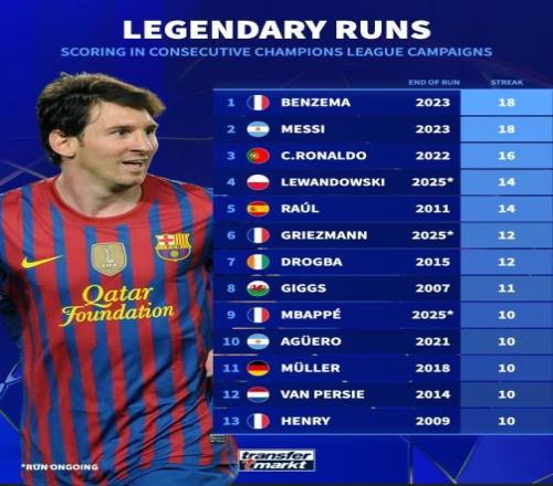 北京時(shí)間11月27日,德轉(zhuǎn)統(tǒng)計(jì)出了歐冠歷史連續(xù)最長賽季進(jìn)球的10位球員,本澤馬和梅西同以連續(xù)18個(gè)賽季歐冠進(jìn)球排名第一,C羅連續(xù)16個(gè)賽季進(jìn)球排名第三。