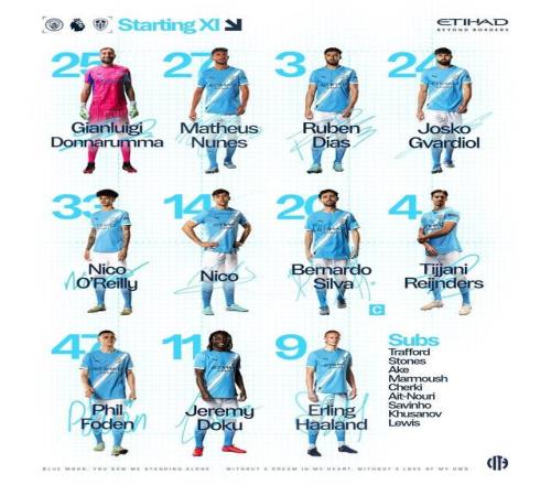 曼城首發(fā):25-多納魯馬、27-馬特烏斯-努內(nèi)斯、3-魯本-迪亞斯、24-格瓦迪奧爾、33-尼科-奧賴利、14-尼科-岡薩雷斯、20-伯納多-席爾瓦、4-賴因德斯、47-福登、11-多庫、9-哈蘭德