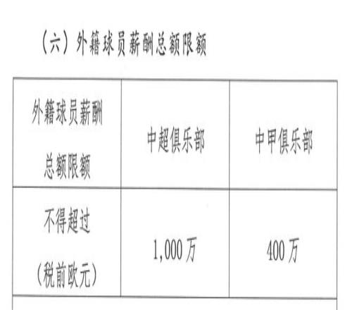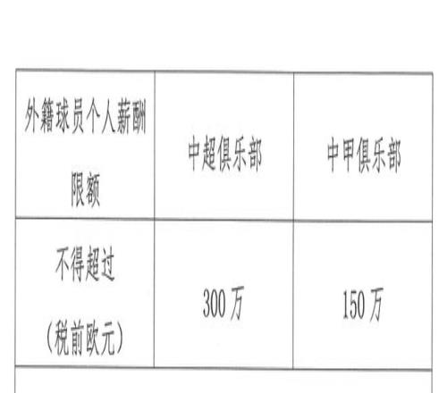 外籍球員個人年薪上限為中超300萬歐元、中甲150萬歐元;俱樂部外援薪酬總額上限為中超1000萬歐元、中甲400萬歐元。