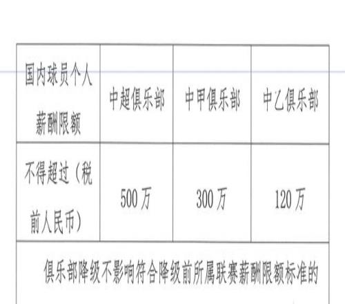 球員薪酬方面,國內球員(含港澳臺)個人年薪稅前上限為:中超500萬元、中甲300萬元、中乙120萬元。國內球員平均年薪亦設限:中超不超過300萬元、中甲150萬元、中乙50萬元。
