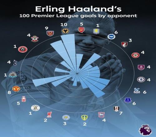 對手方面,哈蘭德堪稱“狼隊克星”,6次交鋒打入10球,僅用21次射門,平均每射門預(yù)期進球高達(dá)0.57。此外,他對西漢姆聯(lián)(9球)、曼聯(lián)(8球)和富勒姆(7球)也屢有斬獲。效率最高的對手是伊普斯維奇,上賽季兩場攻入4球。目前他對陣過的所有英超球隊均有進球,僅對紐卡、維拉、盧頓和謝菲聯(lián)四隊各入1球。