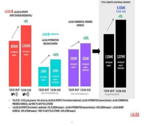 根據(jù)新合同,西甲聯(lián)盟國內(nèi)視聽版權(quán)總收入包括:西甲聯(lián)賽(LALIGA EA SPORTS)付費電視板塊收入52.5億歐元、商業(yè)場所(HORECA)板塊收入6.5億歐元、西乙聯(lián)賽(LALIGA HYPERMOTION)板塊收入1.75億歐元、免費電視及賽事集錦版權(quán)收入 6000萬歐元。各項收入總計達(dá)到61.35億歐元,這較上一周期增長 9%。