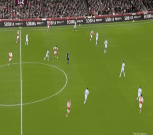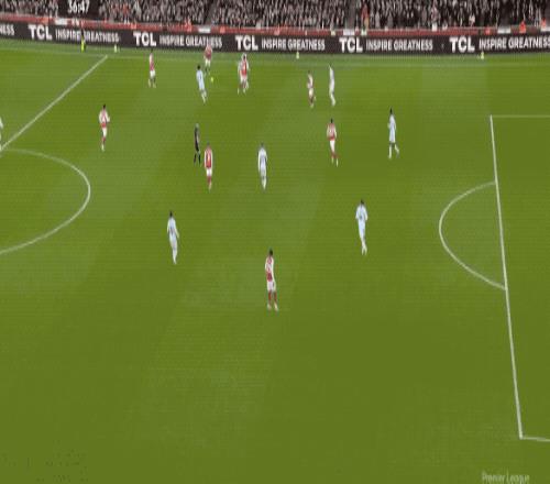 第37分鐘,阿森納前場搶斷,梅里諾起到軸心作用,賴斯的傳中正好越過兩名后衛(wèi),馬杜埃凱的射門被后衛(wèi)擋出底線。