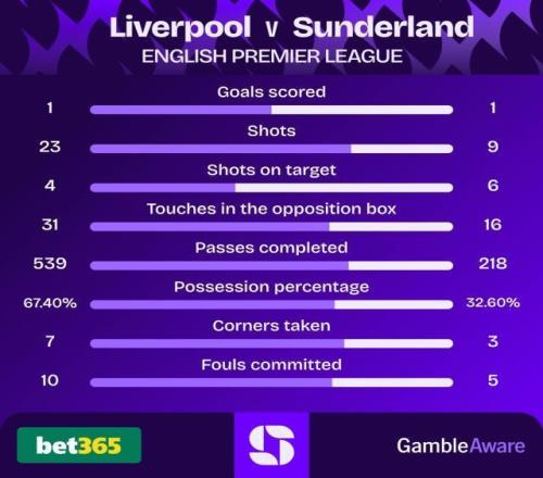 英超聯(lián)賽第14輪,利物浦主場(chǎng)迎戰(zhàn)戰(zhàn)績不俗的升班馬桑德蘭。下半場(chǎng)希姆斯丁·塔勒比遠(yuǎn)射折射破門,維爾茨禁區(qū)內(nèi)射門造成穆凱萊的烏龍,終場(chǎng)前費(fèi)代里科·基耶薩攔下了桑德蘭的單刀。最終兩隊(duì)1比1在安菲爾德握手言和,利物浦連續(xù)三場(chǎng)英超主場(chǎng)不勝。