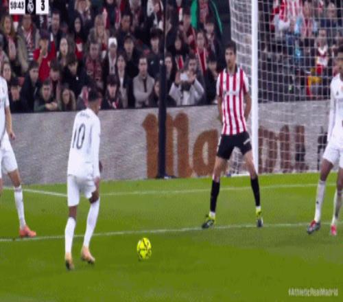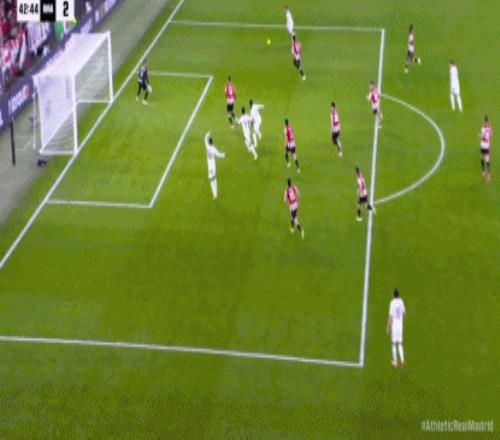 第13分鐘,皇馬后場失誤,畢爾巴鄂競技斷球反擊,N威廉姆斯斷球往前推進后兜傳門前,古魯澤塔點球點處搶點凌空掃射踢飛了。第17分鐘,皇馬左路快攻,姆巴佩送出精妙直塞,維尼修斯插上突入禁區(qū)獲得小角度半單刀良機,只是他沒有射門,想著橫傳做餅,被回防球員將球擋出底線。第25分鐘,畢爾巴鄂競技4分鐘內(nèi)兩次左側(cè)制造殺機,古魯澤塔和貝倫格爾都獲得超近距離良機,只不過他們的大力推射都被庫爾圖瓦奮勇?lián)涑觥?/p>
