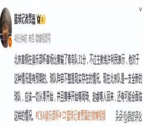 賽后,許利民談到北京男籃輸31分的相關(guān)話題表示:這種情況是有預(yù)期的。球隊(duì)陣容不整是現(xiàn)實(shí)存在的情況。現(xiàn)在北京隊(duì)是一支全新的球隊(duì),應(yīng)該一切從零開(kāi)始,并且賽季開(kāi)始后周琦、趙睿等人回來(lái),還有可能會(huì)面臨這樣的情況。