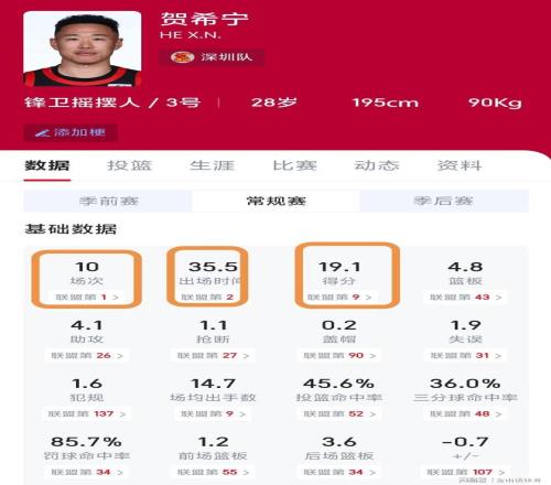 本賽季,賀希寧迎來(lái)自己生涯的巔峰期。截止目前,賀希寧場(chǎng)均出戰(zhàn)35.5分鐘,出場(chǎng)時(shí)間,位列全聯(lián)盟第2位。40分鐘比賽打了近36分鐘,也就是說(shuō),賀希寧每場(chǎng)比賽只休息了4分鐘,幾乎是打滿全場(chǎng)。而他場(chǎng)均19.1分,位列全聯(lián)盟第9,排在本土球員第2位。